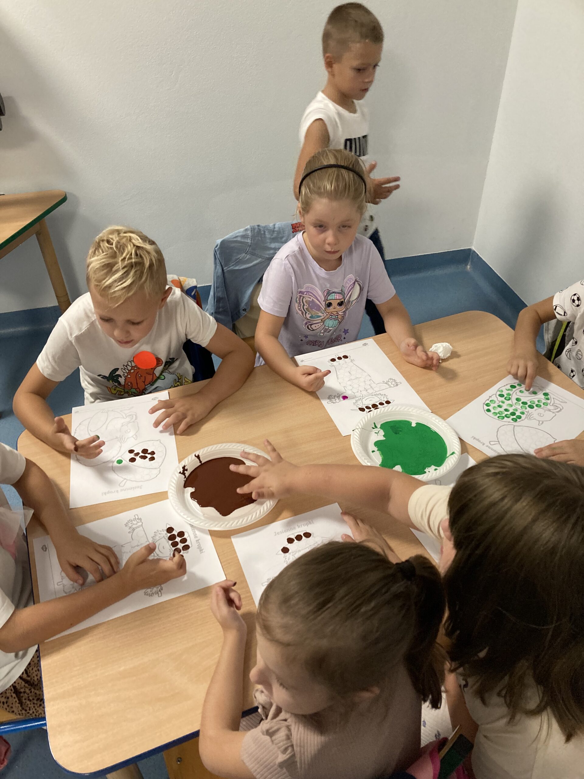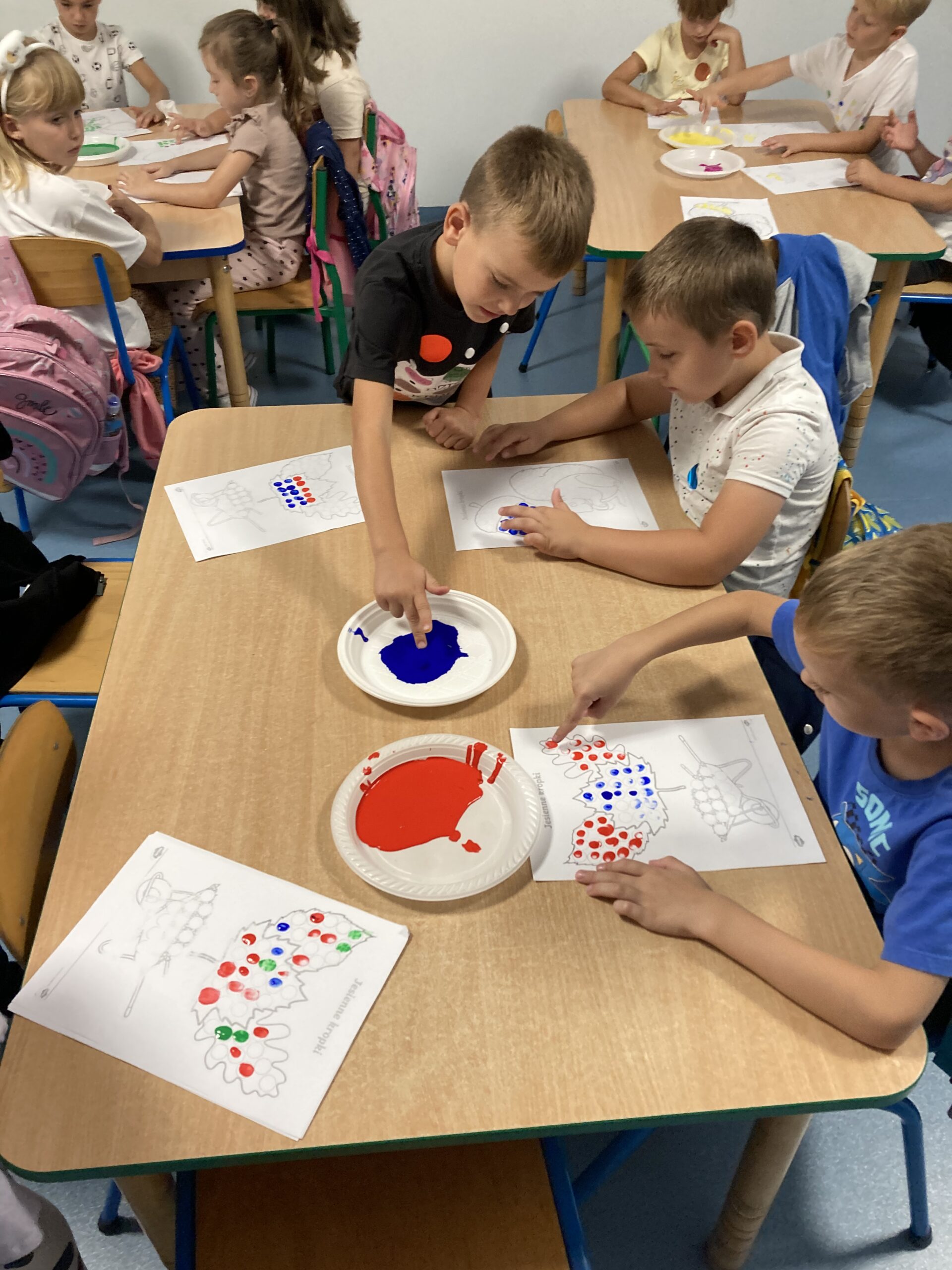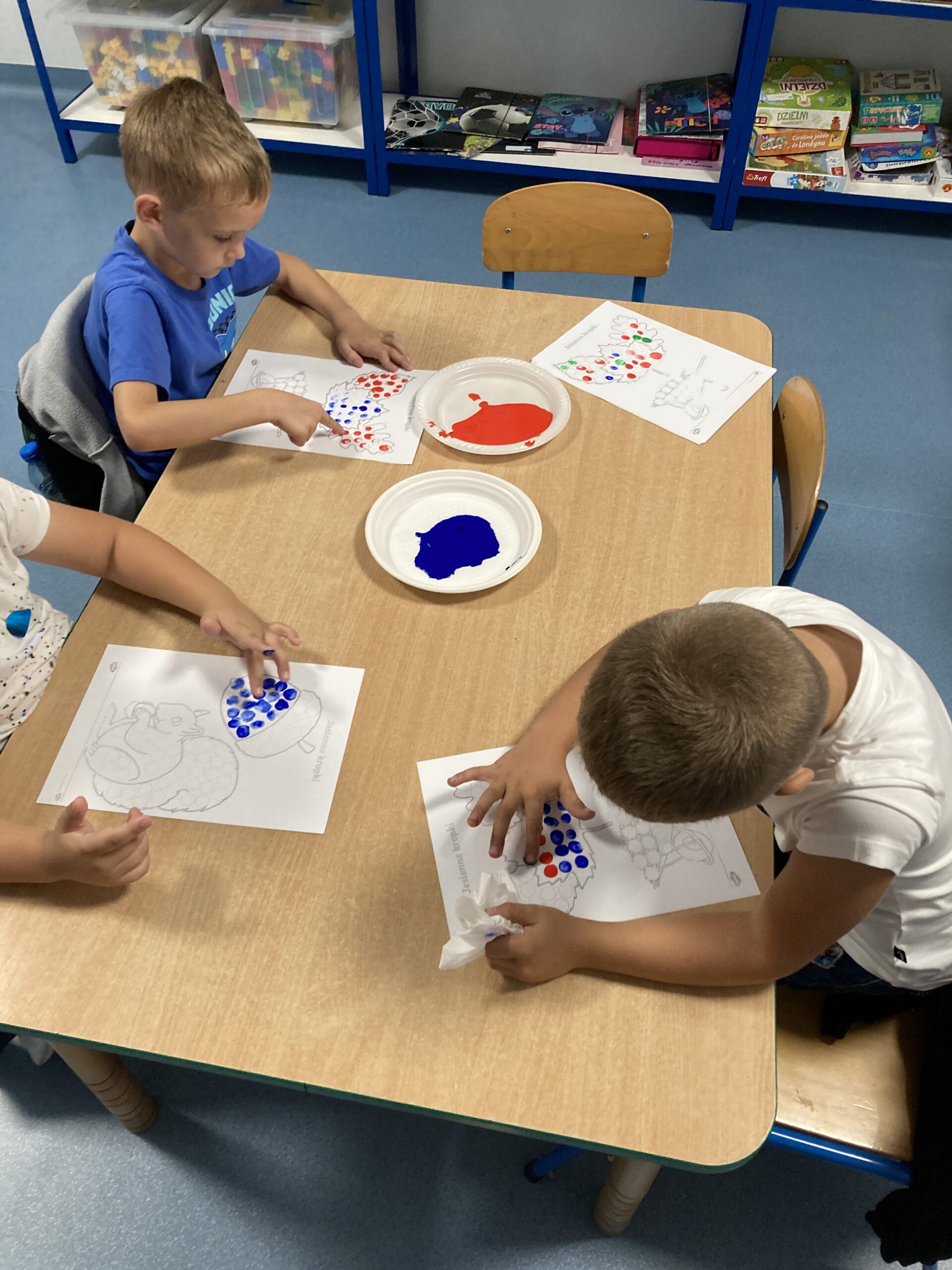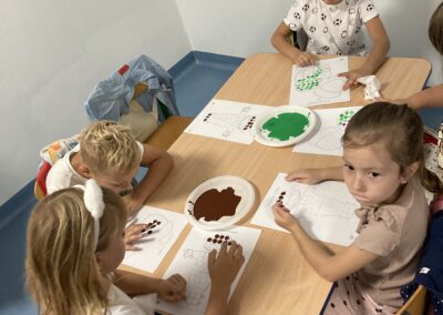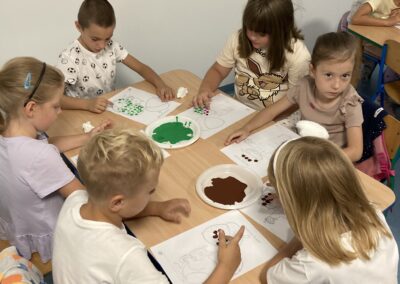 Na zakończenie dzieci bawiły się farbami – zamiast pędzelków używały paluszków, stemplując kolorowe kropki, którymi ozdabiały jesienne prace plastyczne.
