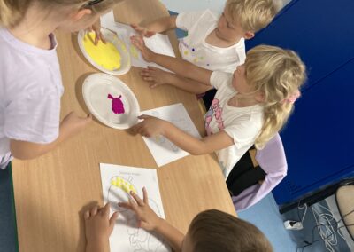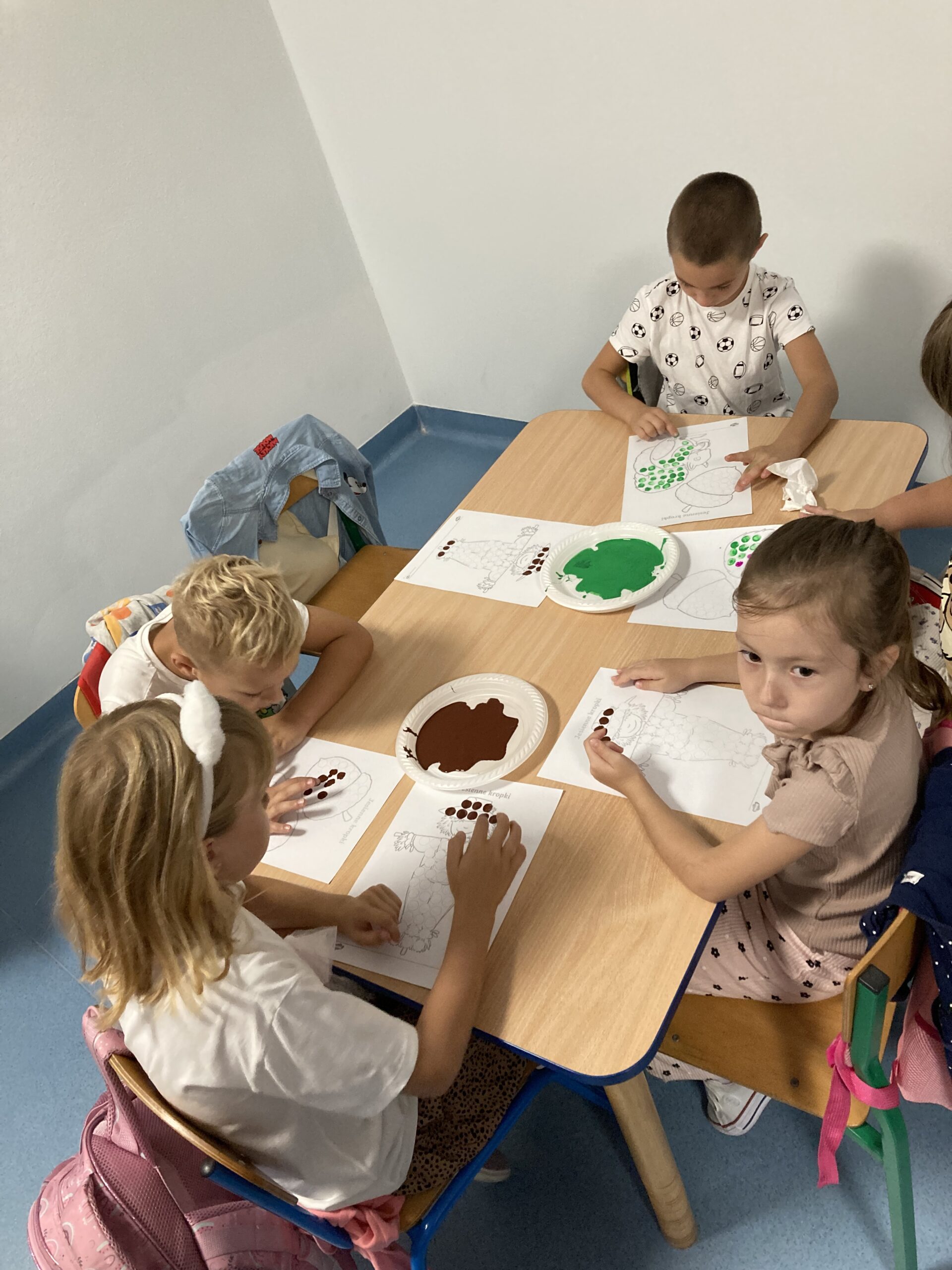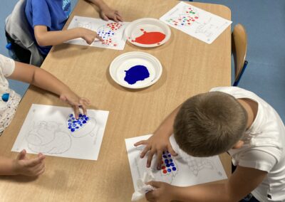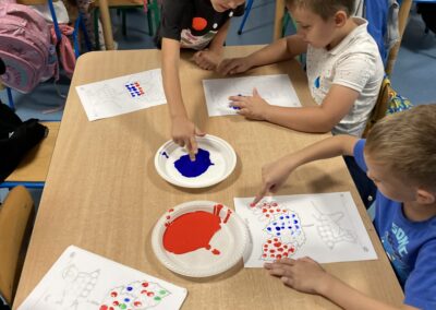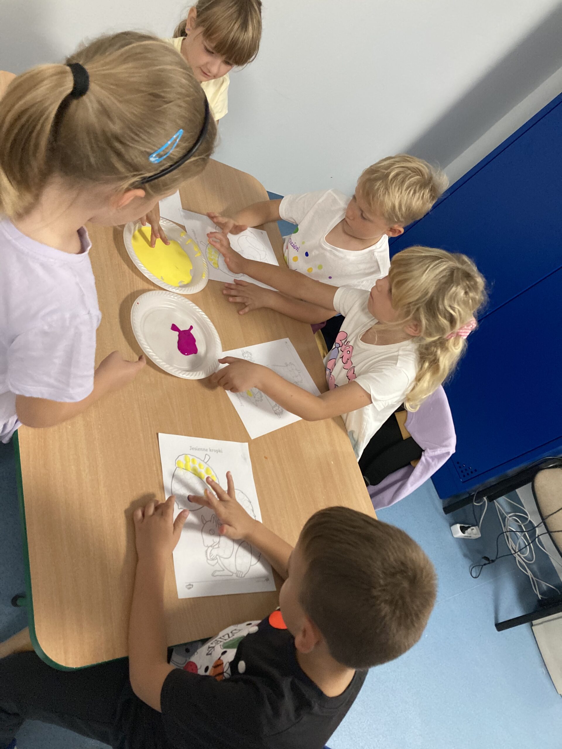 Na zakończenie dzieci bawiły się farbami – zamiast pędzelków używały paluszków, stemplując kolorowe kropki, którymi ozdabiały jesienne prace plastyczne.