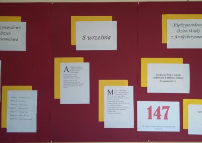8 września obchodzony jest Międzynarodowy Dzień Walki z Analfabetyzmem. Celem tego święta jest rozpowszechnienie potrzeby umiejętności pisania oraz czytania, a także nauczania ich na całym świecie. To czas, kiedy w Polsce odbywają się różnego rodzaju działania – liczne konkursy z zakresu wiedzy o literaturze oraz konkursy ortograficzne. Również nasza szkoła przyłączyła się do obchodów tego święta. Wśród uczniów i nauczycieli zostali wybrani Mistrzowie Pióra, czyli osoby, które mają ładny i czytelny charakter pisma. Po raz drugi cała społeczność szkolna próbowała tego dnia pobić rekord wypożyczenia książek z biblioteki.