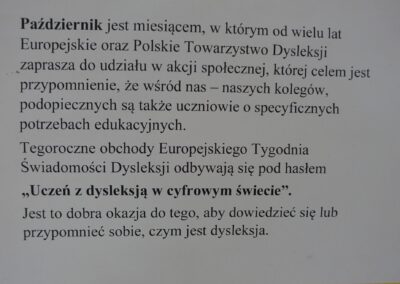 W poniedziałek 16 października rozpoczęliśmy w naszej szkole obchody Europejskiego Tygodnia Świadomości Dysleksji. W kolejnych dniach uczniowie klas IV-VI czytali baśnie Andersena młodszym koleżankom i kolegom. Powstały piękne ilustracje, które można podziwiać na dolnym korytarzu. Natomiast w piątek cała społeczność szkoły poznała sylwetki sławnych osób borykających się z dysleksja. Prezentacje przygotowali uczniowie klas najstarszych. Przez cały tydzień na zajęciach dodatkowych uczniowie pracowali z wykorzystaniem materiałów multimedialnych.